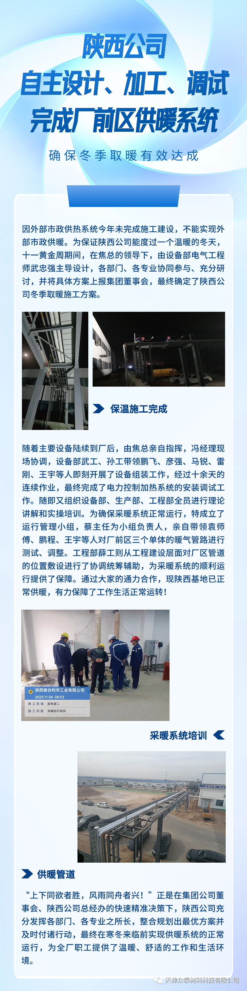 陜西分公司自主設(shè)計(jì)、加工、調(diào)試完成廠前區(qū)供暖系統(tǒng),確保冬季取暖有效達(dá)成